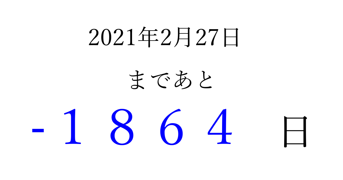 2021年2月27日(土)は もう 0000 日過ぎました 追加すると、トップページからすぐ選べるようになります ※2026/04/06現在の結果です。 最新の状態に更新する ↓シェアして、タイムライン上にカウントダウンを表示しよう!↓ 📤 この結果を共有する Tweet シェア Threads Bluesky 別の日付でカウントダウン 2021年2月のカレンダー このページをブックマークに追加すると、いつでもカウントダウンを確認できます。 (PC: Ctrl+D / Mac: ⌘+D) hitome-notes.comでは以下のページも運営しています。 指定日と期間から日付を計算 | ガチャ確率計算・シミュレーション | プライバシー・ポリシー 運営者:Avocado