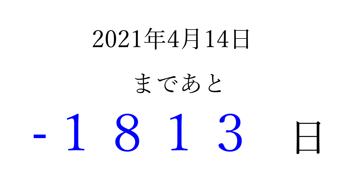 2021年4月14日(水)は もう 0000 日過ぎました 追加すると、トップページからすぐ選べるようになります ※2026/04/01現在の結果です。 最新の状態に更新する ↓シェアして、タイムライン上にカウントダウンを表示しよう!↓ 📤 この結果を共有する Tweet シェア Threads Bluesky 別の日付でカウントダウン 2021年4月のカレンダー このページをブックマークに追加すると、いつでもカウントダウンを確認できます。 (PC: Ctrl+D / Mac: ⌘+D) hitome-notes.comでは以下のページも運営しています。 指定日と期間から日付を計算 | ガチャ確率計算・シミュレーション | プライバシー・ポリシー 運営者:Avocado