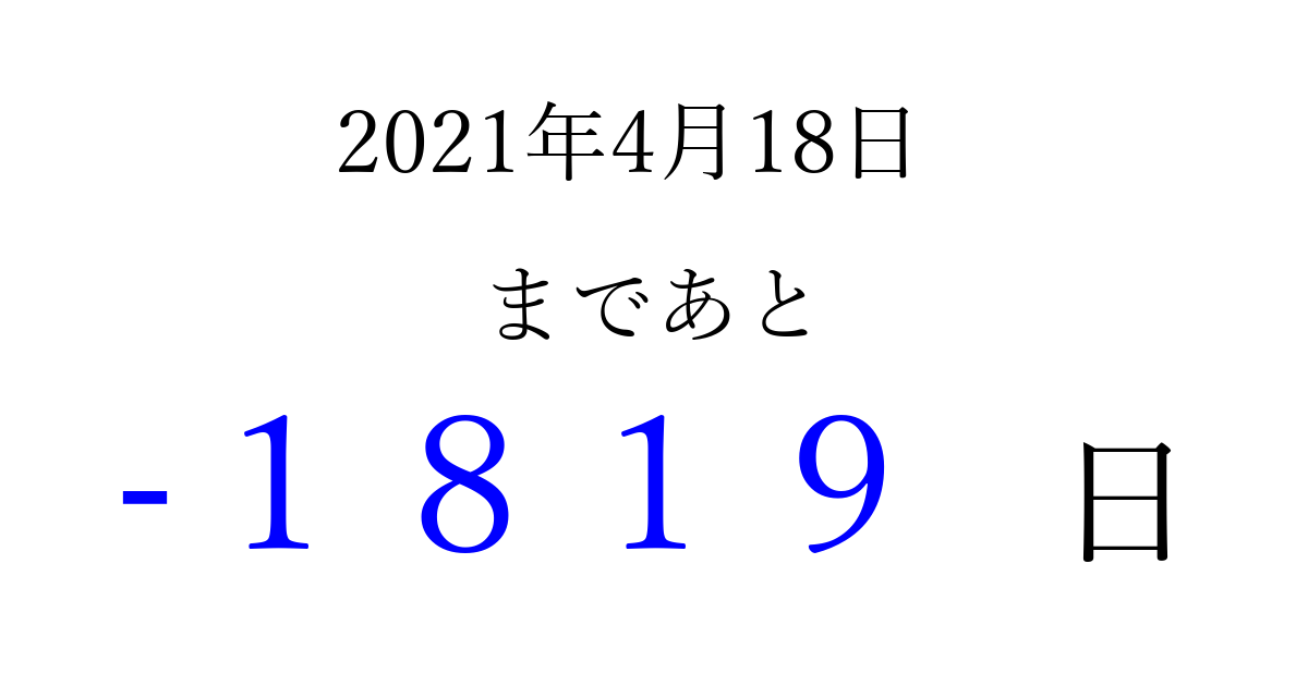 2021年4月18日(日)は もう 0000 日過ぎました 追加すると、トップページからすぐ選べるようになります ※2026/04/11現在の結果です。 最新の状態に更新する ↓シェアして、タイムライン上にカウントダウンを表示しよう!↓ 📤 この結果を共有する Tweet シェア Threads Bluesky 別の日付でカウントダウン 2021年4月のカレンダー このページをブックマークに追加すると、いつでもカウントダウンを確認できます。 (PC: Ctrl+D / Mac: ⌘+D) hitome-notes.comでは以下のページも運営しています。 指定日と期間から日付を計算 | ガチャ確率計算・シミュレーション | プライバシー・ポリシー 運営者:Avocado