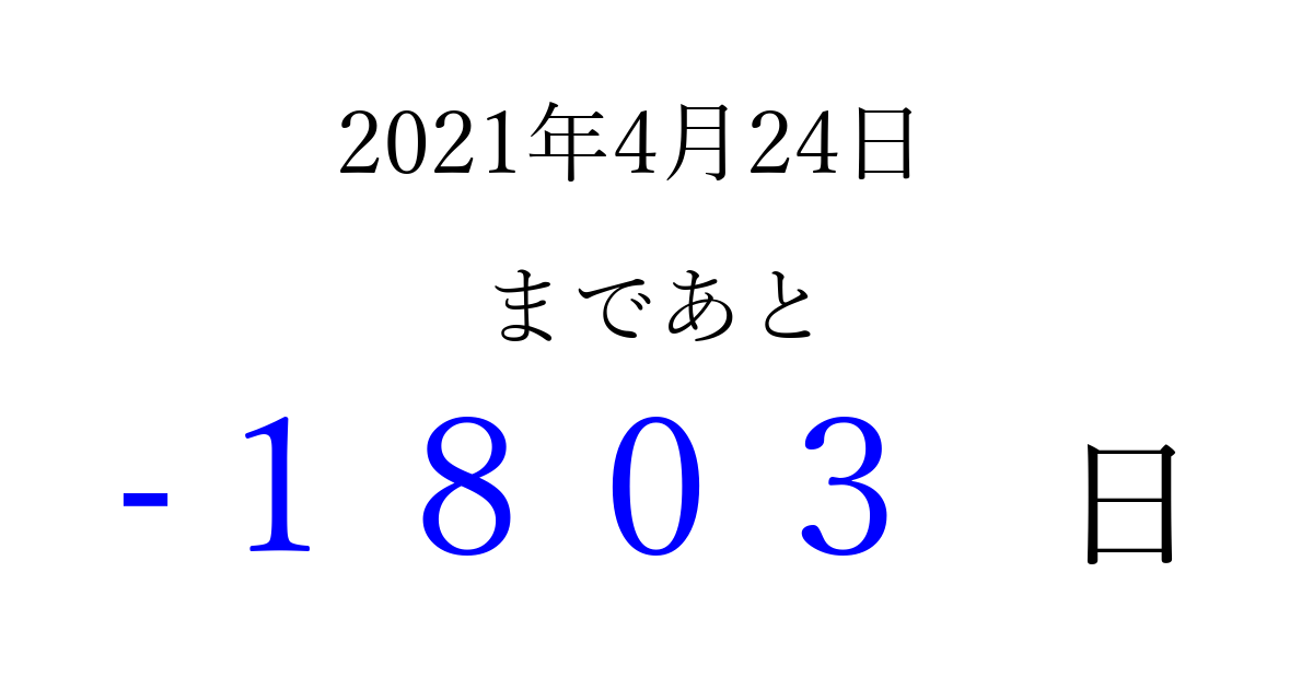 2021年4月24日(土)は もう 0000 日過ぎました 追加すると、トップページからすぐ選べるようになります ※2026/04/01現在の結果です。 最新の状態に更新する ↓シェアして、タイムライン上にカウントダウンを表示しよう!↓ 📤 この結果を共有する Tweet シェア Threads Bluesky 別の日付でカウントダウン 2021年4月のカレンダー このページをブックマークに追加すると、いつでもカウントダウンを確認できます。 (PC: Ctrl+D / Mac: ⌘+D) hitome-notes.comでは以下のページも運営しています。 指定日と期間から日付を計算 | ガチャ確率計算・シミュレーション | プライバシー・ポリシー 運営者:Avocado