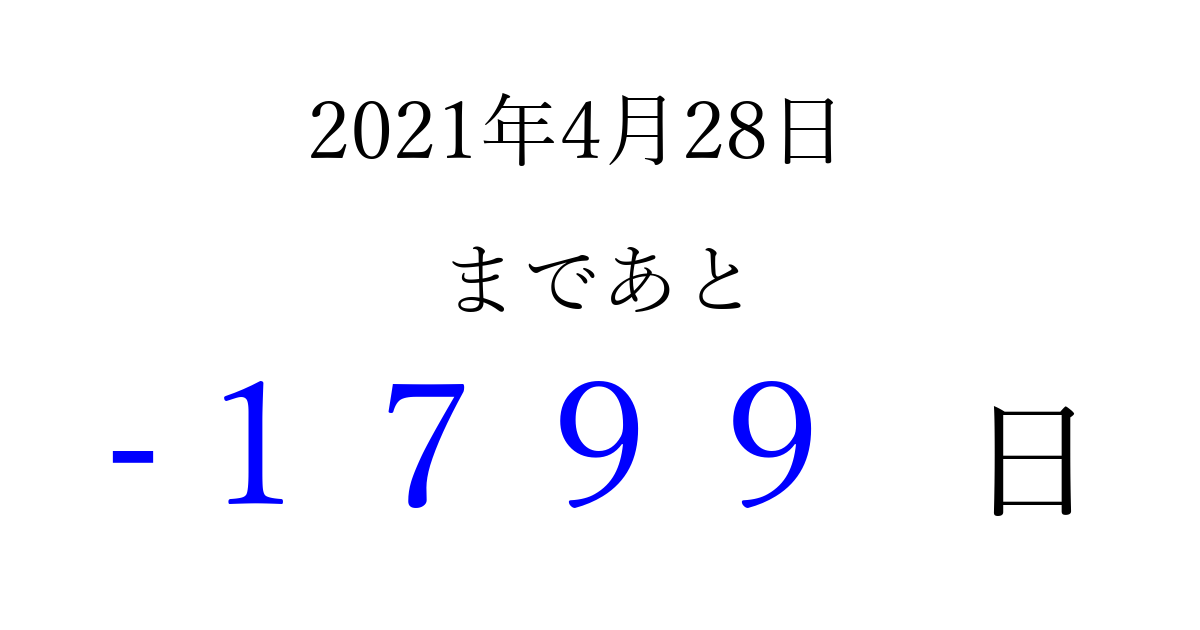 2021年4月28日(水)は もう 0000 日過ぎました 追加すると、トップページからすぐ選べるようになります ※2026/04/01現在の結果です。 最新の状態に更新する ↓シェアして、タイムライン上にカウントダウンを表示しよう!↓ 📤 この結果を共有する Tweet シェア Threads Bluesky 別の日付でカウントダウン 2021年4月のカレンダー このページをブックマークに追加すると、いつでもカウントダウンを確認できます。 (PC: Ctrl+D / Mac: ⌘+D) hitome-notes.comでは以下のページも運営しています。 指定日と期間から日付を計算 | ガチャ確率計算・シミュレーション | プライバシー・ポリシー 運営者:Avocado
