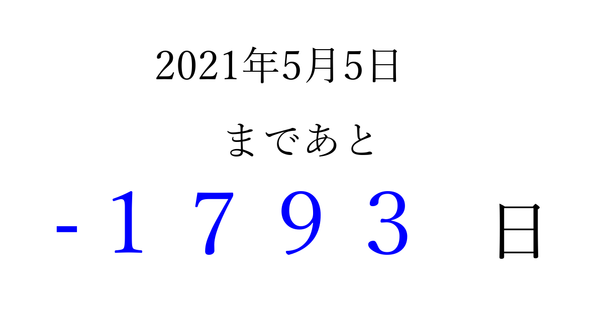 2021年5月5日(水)は もう 0000 日過ぎました 追加すると、トップページからすぐ選べるようになります ※2026/04/02現在の結果です。 最新の状態に更新する ↓シェアして、タイムライン上にカウントダウンを表示しよう!↓ 📤 この結果を共有する Tweet シェア Threads Bluesky この日は何の日?こどもの日 別の日付でカウントダウン 2021年5月のカレンダー このページをブックマークに追加すると、いつでもカウントダウンを確認できます。 (PC: Ctrl+D / Mac: ⌘+D) hitome-notes.comでは以下のページも運営しています。 指定日と期間から日付を計算 | ガチャ確率計算・シミュレーション | プライバシー・ポリシー 運営者:Avocado