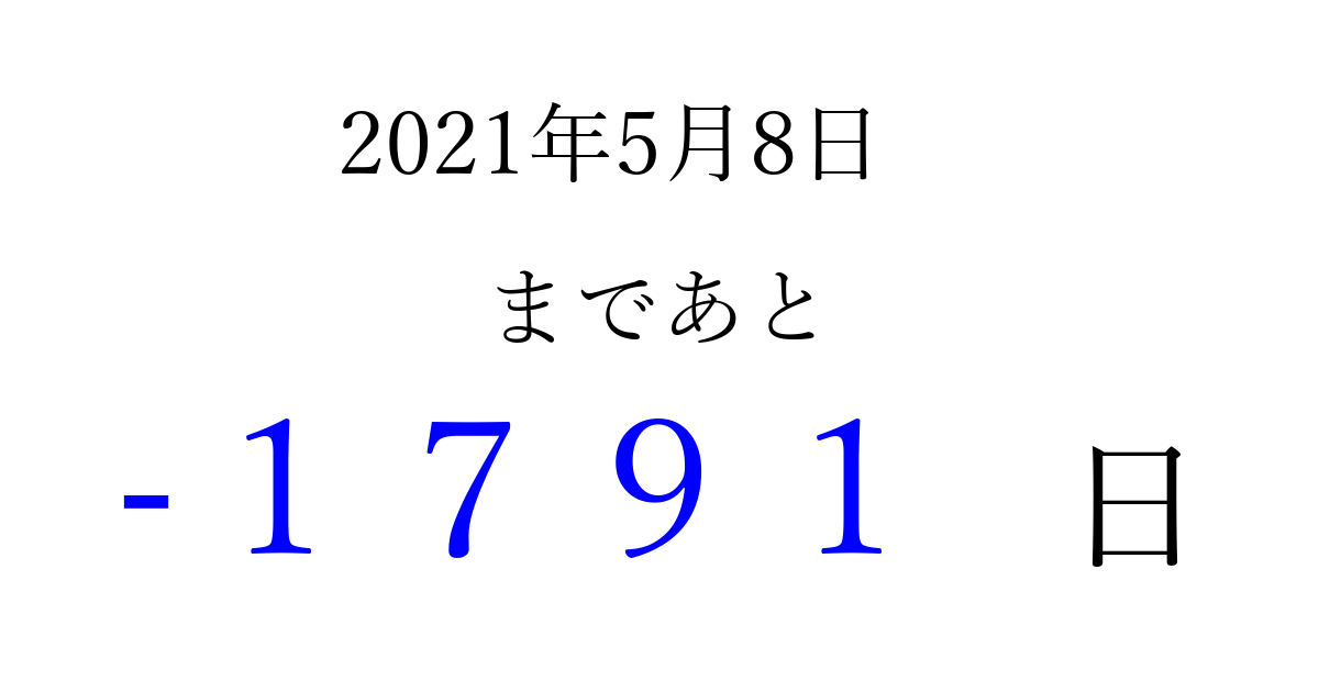 2021年5月8日(土)は もう 0000 日過ぎました 追加すると、トップページからすぐ選べるようになります ※2026/04/03現在の結果です。 最新の状態に更新する ↓シェアして、タイムライン上にカウントダウンを表示しよう!↓ 📤 この結果を共有する Tweet シェア Threads Bluesky 別の日付でカウントダウン 2021年5月のカレンダー このページをブックマークに追加すると、いつでもカウントダウンを確認できます。 (PC: Ctrl+D / Mac: ⌘+D) hitome-notes.comでは以下のページも運営しています。 指定日と期間から日付を計算 | ガチャ確率計算・シミュレーション | プライバシー・ポリシー 運営者:Avocado