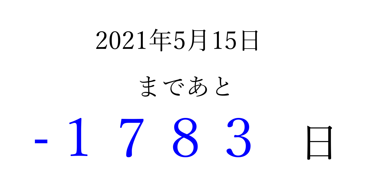 2021年5月15日(土)は もう 0000 日過ぎました 追加すると、トップページからすぐ選べるようになります ※2026/04/02現在の結果です。 最新の状態に更新する ↓シェアして、タイムライン上にカウントダウンを表示しよう!↓ 📤 この結果を共有する Tweet シェア Threads Bluesky 別の日付でカウントダウン 2021年5月のカレンダー このページをブックマークに追加すると、いつでもカウントダウンを確認できます。 (PC: Ctrl+D / Mac: ⌘+D) hitome-notes.comでは以下のページも運営しています。 指定日と期間から日付を計算 | ガチャ確率計算・シミュレーション | プライバシー・ポリシー 運営者:Avocado