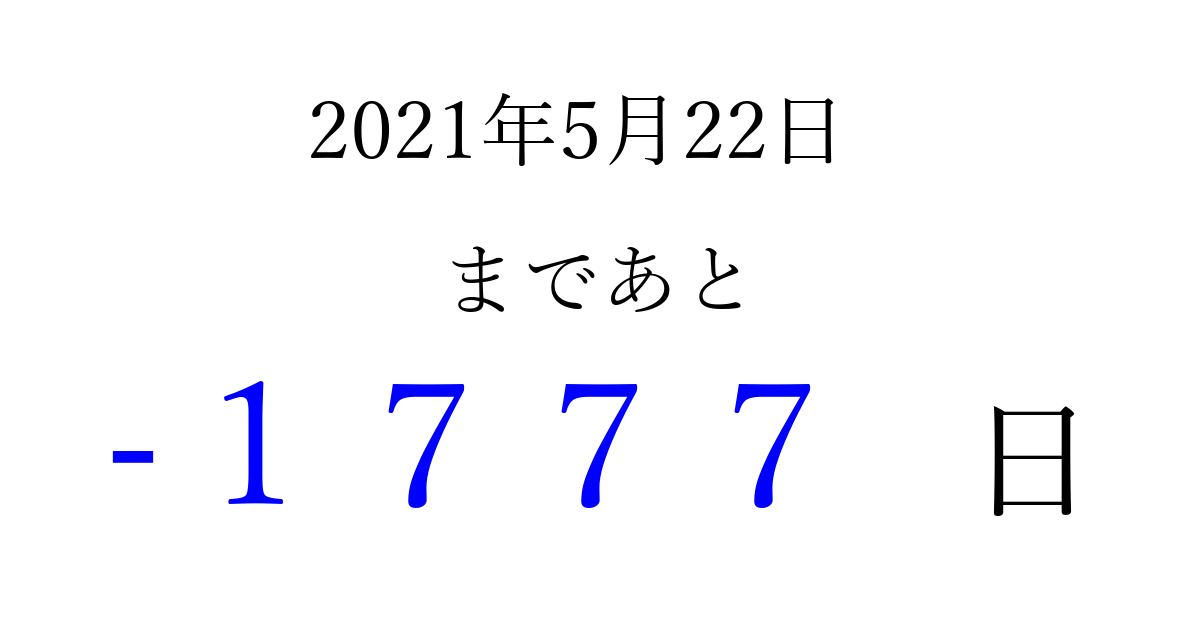 2021年5月22日(土)は もう 0000 日過ぎました 追加すると、トップページからすぐ選べるようになります ※2026/04/03現在の結果です。 最新の状態に更新する ↓シェアして、タイムライン上にカウントダウンを表示しよう!↓ 📤 この結果を共有する Tweet シェア Threads Bluesky 別の日付でカウントダウン 2021年5月のカレンダー このページをブックマークに追加すると、いつでもカウントダウンを確認できます。 (PC: Ctrl+D / Mac: ⌘+D) hitome-notes.comでは以下のページも運営しています。 指定日と期間から日付を計算 | ガチャ確率計算・シミュレーション | プライバシー・ポリシー 運営者:Avocado