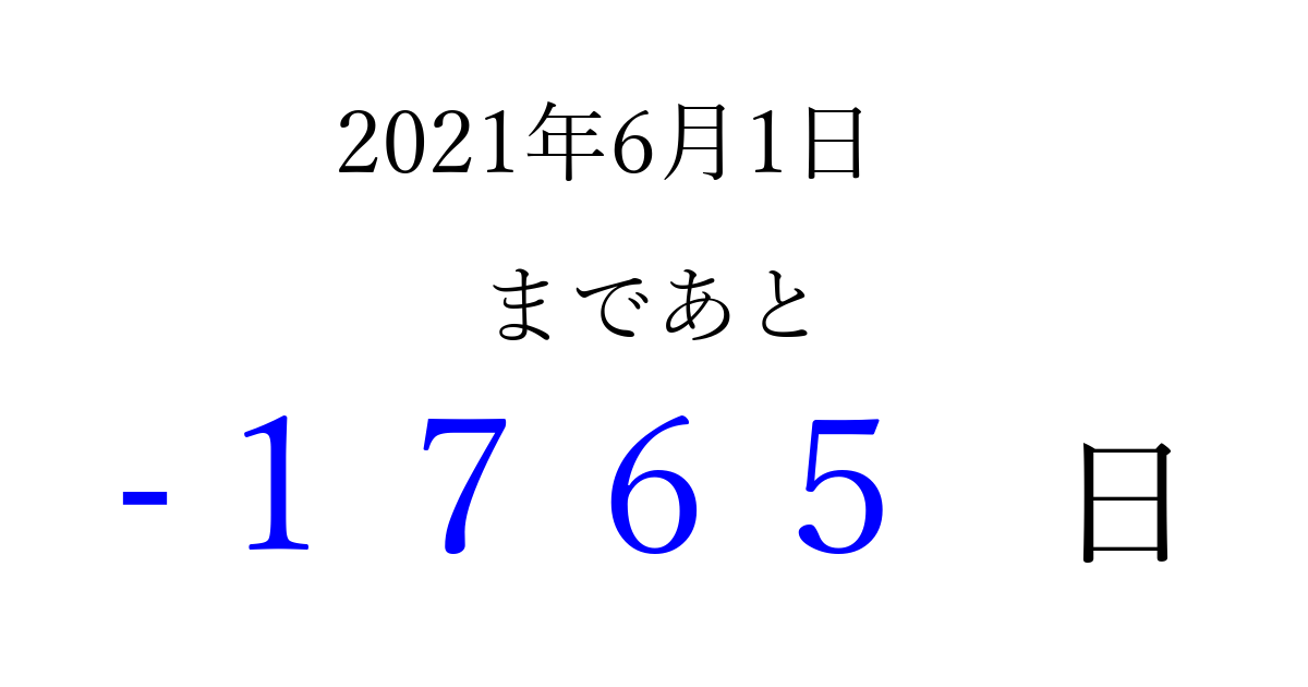 2021年6月1日(火)は もう 0000 日過ぎました 追加すると、トップページからすぐ選べるようになります ※2026/04/01現在の結果です。 最新の状態に更新する ↓シェアして、タイムライン上にカウントダウンを表示しよう!↓ 📤 この結果を共有する Tweet シェア Threads Bluesky 別の日付でカウントダウン 2021年6月のカレンダー このページをブックマークに追加すると、いつでもカウントダウンを確認できます。 (PC: Ctrl+D / Mac: ⌘+D) hitome-notes.comでは以下のページも運営しています。 指定日と期間から日付を計算 | ガチャ確率計算・シミュレーション | プライバシー・ポリシー 運営者:Avocado