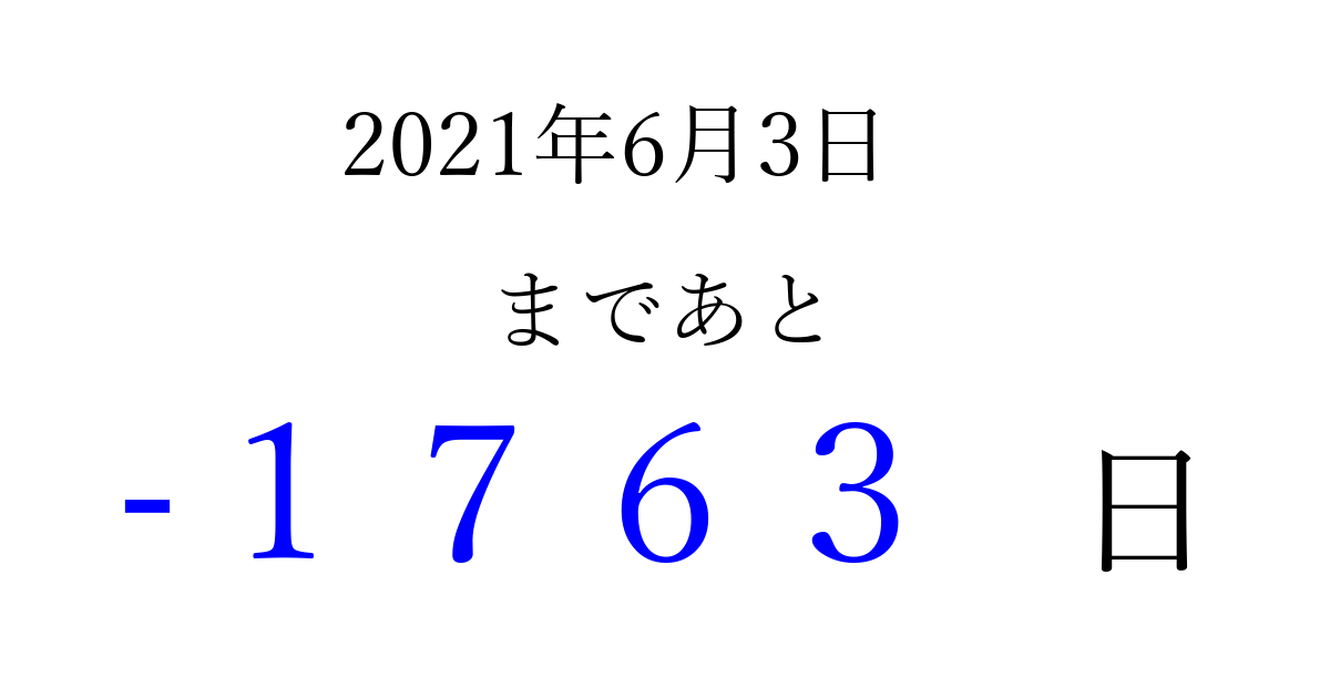 2021年6月3日(木)は もう 0000 日過ぎました 追加すると、トップページからすぐ選べるようになります ※2026/04/01現在の結果です。 最新の状態に更新する ↓シェアして、タイムライン上にカウントダウンを表示しよう!↓ 📤 この結果を共有する Tweet シェア Threads Bluesky 別の日付でカウントダウン 2021年6月のカレンダー このページをブックマークに追加すると、いつでもカウントダウンを確認できます。 (PC: Ctrl+D / Mac: ⌘+D) hitome-notes.comでは以下のページも運営しています。 指定日と期間から日付を計算 | ガチャ確率計算・シミュレーション | プライバシー・ポリシー 運営者:Avocado