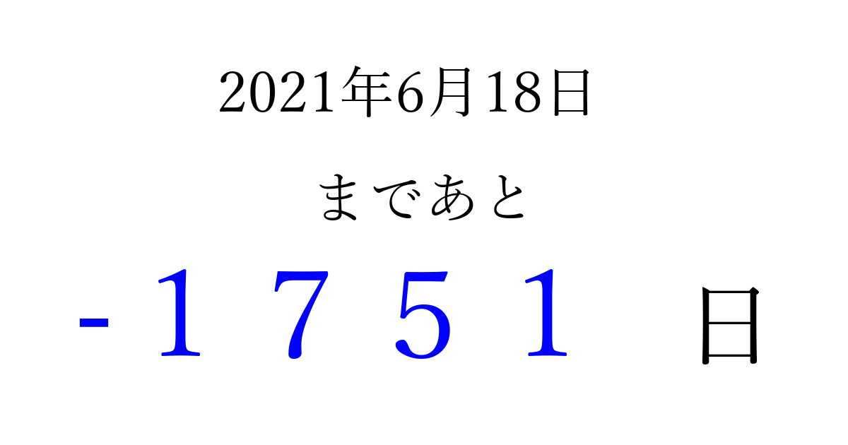 2021年6月18日(金)は もう 0000 日過ぎました 追加すると、トップページからすぐ選べるようになります ※2026/04/04現在の結果です。 最新の状態に更新する ↓シェアして、タイムライン上にカウントダウンを表示しよう!↓ 📤 この結果を共有する Tweet シェア Threads Bluesky 別の日付でカウントダウン 2021年6月のカレンダー このページをブックマークに追加すると、いつでもカウントダウンを確認できます。 (PC: Ctrl+D / Mac: ⌘+D) hitome-notes.comでは以下のページも運営しています。 指定日と期間から日付を計算 | ガチャ確率計算・シミュレーション | プライバシー・ポリシー 運営者:Avocado
