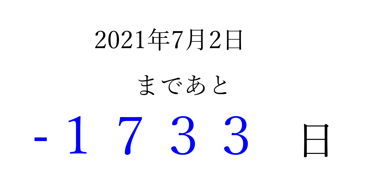 2021年7月2日(金)は もう 0000 日過ぎました 追加すると、トップページからすぐ選べるようになります ※2026/03/31現在の結果です。 最新の状態に更新する ↓シェアして、タイムライン上にカウントダウンを表示しよう!↓ 📤 この結果を共有する Tweet シェア Threads Bluesky 別の日付でカウントダウン 2021年7月のカレンダー このページをブックマークに追加すると、いつでもカウントダウンを確認できます。 (PC: Ctrl+D / Mac: ⌘+D) hitome-notes.comでは以下のページも運営しています。 指定日と期間から日付を計算 | ガチャ確率計算・シミュレーション | プライバシー・ポリシー 運営者:Avocado