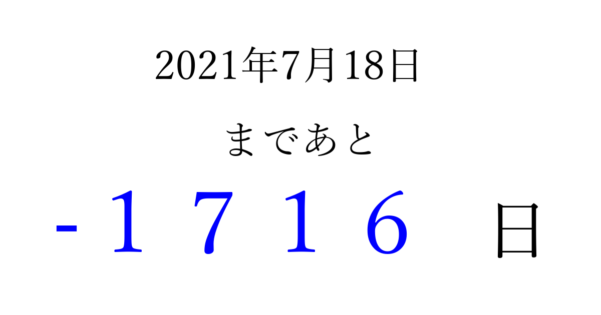 2021年7月18日(日)は もう 0000 日過ぎました 追加すると、トップページからすぐ選べるようになります ※2026/03/30現在の結果です。 最新の状態に更新する ↓シェアして、タイムライン上にカウントダウンを表示しよう!↓ 📤 この結果を共有する Tweet シェア Threads Bluesky 別の日付でカウントダウン 2021年7月のカレンダー このページをブックマークに追加すると、いつでもカウントダウンを確認できます。 (PC: Ctrl+D / Mac: ⌘+D) hitome-notes.comでは以下のページも運営しています。 指定日と期間から日付を計算 | ガチャ確率計算・シミュレーション | プライバシー・ポリシー 運営者:Avocado
