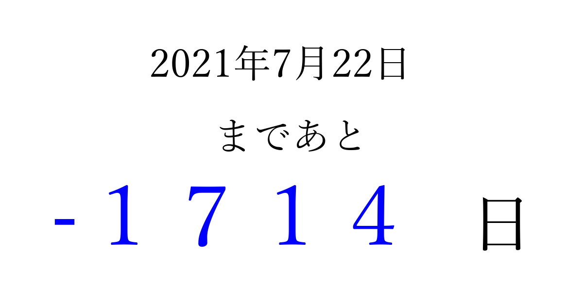2021年7月22日(木)は もう 0000 日過ぎました 追加すると、トップページからすぐ選べるようになります ※2026/04/01現在の結果です。 最新の状態に更新する ↓シェアして、タイムライン上にカウントダウンを表示しよう!↓ 📤 この結果を共有する Tweet シェア Threads Bluesky この日は何の日?海の日 別の日付でカウントダウン 2021年7月のカレンダー このページをブックマークに追加すると、いつでもカウントダウンを確認できます。 (PC: Ctrl+D / Mac: ⌘+D) hitome-notes.comでは以下のページも運営しています。 指定日と期間から日付を計算 | ガチャ確率計算・シミュレーション | プライバシー・ポリシー 運営者:Avocado