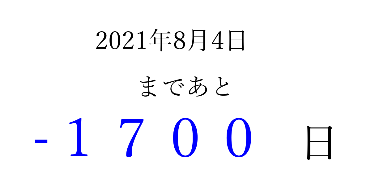 2021年8月4日(水)は もう 0000 日過ぎました 追加すると、トップページからすぐ選べるようになります ※2026/03/31現在の結果です。 最新の状態に更新する ↓シェアして、タイムライン上にカウントダウンを表示しよう!↓ 📤 この結果を共有する Tweet シェア Threads Bluesky 別の日付でカウントダウン 2021年8月のカレンダー このページをブックマークに追加すると、いつでもカウントダウンを確認できます。 (PC: Ctrl+D / Mac: ⌘+D) hitome-notes.comでは以下のページも運営しています。 指定日と期間から日付を計算 | ガチャ確率計算・シミュレーション | プライバシー・ポリシー 運営者:Avocado