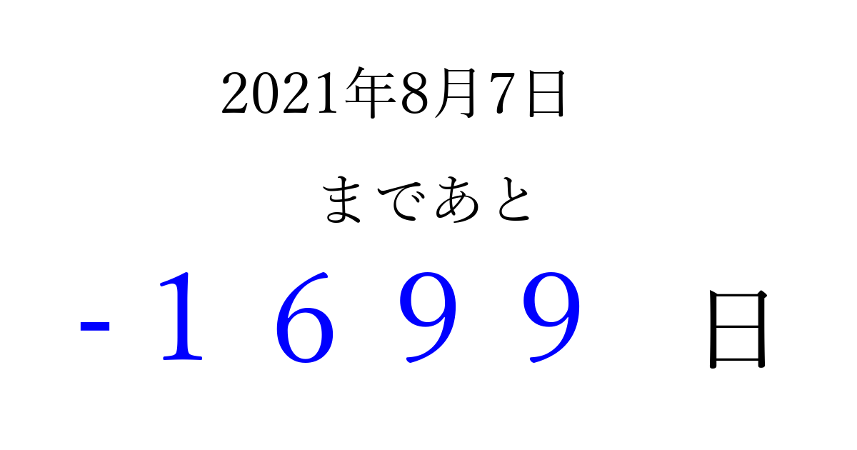2021年8月7日(土)は もう 0000 日過ぎました 追加すると、トップページからすぐ選べるようになります ※2026/04/02現在の結果です。 最新の状態に更新する ↓シェアして、タイムライン上にカウントダウンを表示しよう!↓ 📤 この結果を共有する Tweet シェア Threads Bluesky 別の日付でカウントダウン 2021年8月のカレンダー このページをブックマークに追加すると、いつでもカウントダウンを確認できます。 (PC: Ctrl+D / Mac: ⌘+D) hitome-notes.comでは以下のページも運営しています。 指定日と期間から日付を計算 | ガチャ確率計算・シミュレーション | プライバシー・ポリシー 運営者:Avocado