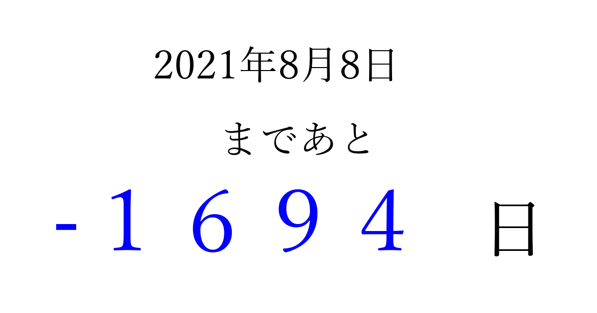 2021年8月8日(日)は もう 0000 日過ぎました 追加すると、トップページからすぐ選べるようになります ※2026/03/29現在の結果です。 最新の状態に更新する ↓シェアして、タイムライン上にカウントダウンを表示しよう!↓ 📤 この結果を共有する Tweet シェア Threads Bluesky この日は何の日?山の日 別の日付でカウントダウン 2021年8月のカレンダー このページをブックマークに追加すると、いつでもカウントダウンを確認できます。 (PC: Ctrl+D / Mac: ⌘+D) hitome-notes.comでは以下のページも運営しています。 指定日と期間から日付を計算 | ガチャ確率計算・シミュレーション | プライバシー・ポリシー 運営者:Avocado