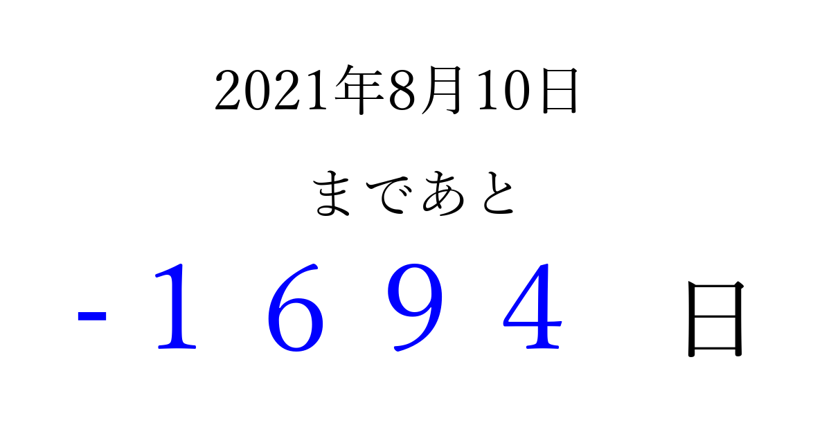 2021年8月10日(火)は もう 0000 日過ぎました 追加すると、トップページからすぐ選べるようになります ※2026/03/31現在の結果です。 最新の状態に更新する ↓シェアして、タイムライン上にカウントダウンを表示しよう!↓ 📤 この結果を共有する Tweet シェア Threads Bluesky 別の日付でカウントダウン 2021年8月のカレンダー このページをブックマークに追加すると、いつでもカウントダウンを確認できます。 (PC: Ctrl+D / Mac: ⌘+D) hitome-notes.comでは以下のページも運営しています。 指定日と期間から日付を計算 | ガチャ確率計算・シミュレーション | プライバシー・ポリシー 運営者:Avocado