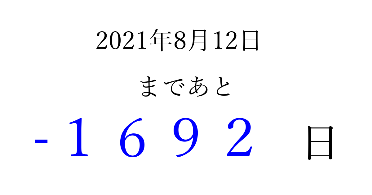 2021年8月12日(木)は もう 0000 日過ぎました 追加すると、トップページからすぐ選べるようになります ※2026/03/31現在の結果です。 最新の状態に更新する ↓シェアして、タイムライン上にカウントダウンを表示しよう!↓ 📤 この結果を共有する Tweet シェア Threads Bluesky 別の日付でカウントダウン 2021年8月のカレンダー このページをブックマークに追加すると、いつでもカウントダウンを確認できます。 (PC: Ctrl+D / Mac: ⌘+D) hitome-notes.comでは以下のページも運営しています。 指定日と期間から日付を計算 | ガチャ確率計算・シミュレーション | プライバシー・ポリシー 運営者:Avocado