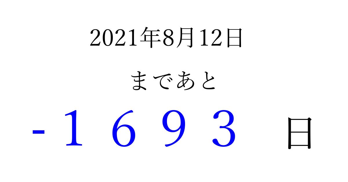 2021年8月12日(木)は もう 0000 日過ぎました 追加すると、トップページからすぐ選べるようになります ※2026/04/01現在の結果です。 最新の状態に更新する ↓シェアして、タイムライン上にカウントダウンを表示しよう!↓ 📤 この結果を共有する Tweet シェア Threads Bluesky 別の日付でカウントダウン 2021年8月のカレンダー このページをブックマークに追加すると、いつでもカウントダウンを確認できます。 (PC: Ctrl+D / Mac: ⌘+D) hitome-notes.comでは以下のページも運営しています。 指定日と期間から日付を計算 | ガチャ確率計算・シミュレーション | プライバシー・ポリシー 運営者:Avocado