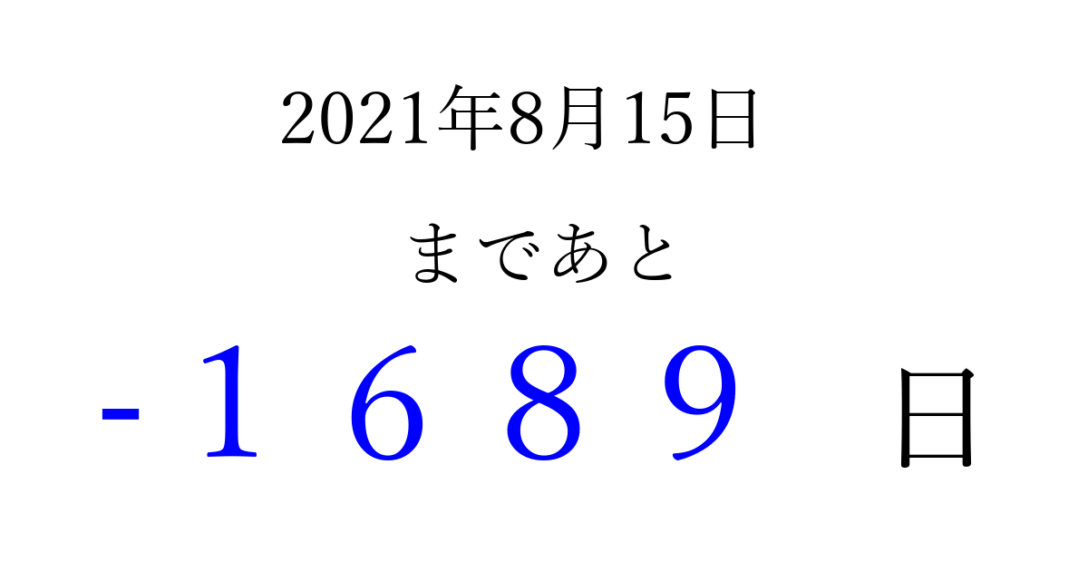 2021年8月15日(日)は もう 0000 日過ぎました 追加すると、トップページからすぐ選べるようになります ※2026/03/31現在の結果です。 最新の状態に更新する ↓シェアして、タイムライン上にカウントダウンを表示しよう!↓ 📤 この結果を共有する Tweet シェア Threads Bluesky 別の日付でカウントダウン 2021年8月のカレンダー このページをブックマークに追加すると、いつでもカウントダウンを確認できます。 (PC: Ctrl+D / Mac: ⌘+D) hitome-notes.comでは以下のページも運営しています。 指定日と期間から日付を計算 | ガチャ確率計算・シミュレーション | プライバシー・ポリシー 運営者:Avocado