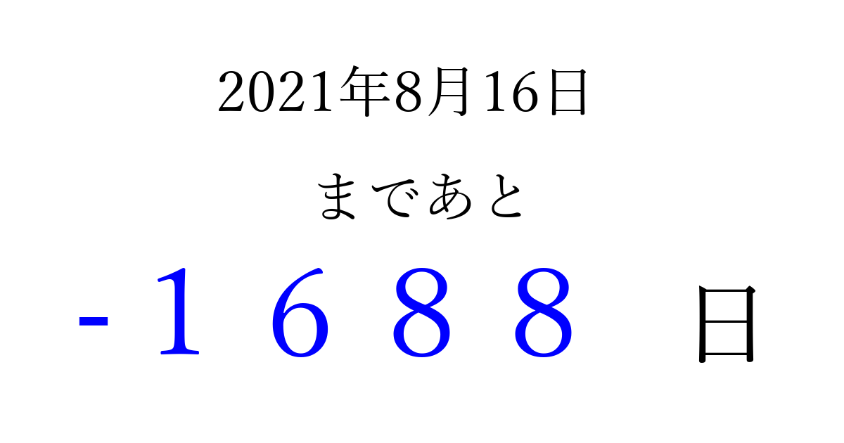 2021年8月16日(月)は もう 0000 日過ぎました 追加すると、トップページからすぐ選べるようになります ※2026/03/31現在の結果です。 最新の状態に更新する ↓シェアして、タイムライン上にカウントダウンを表示しよう!↓ 📤 この結果を共有する Tweet シェア Threads Bluesky 別の日付でカウントダウン 2021年8月のカレンダー このページをブックマークに追加すると、いつでもカウントダウンを確認できます。 (PC: Ctrl+D / Mac: ⌘+D) hitome-notes.comでは以下のページも運営しています。 指定日と期間から日付を計算 | ガチャ確率計算・シミュレーション | プライバシー・ポリシー 運営者:Avocado