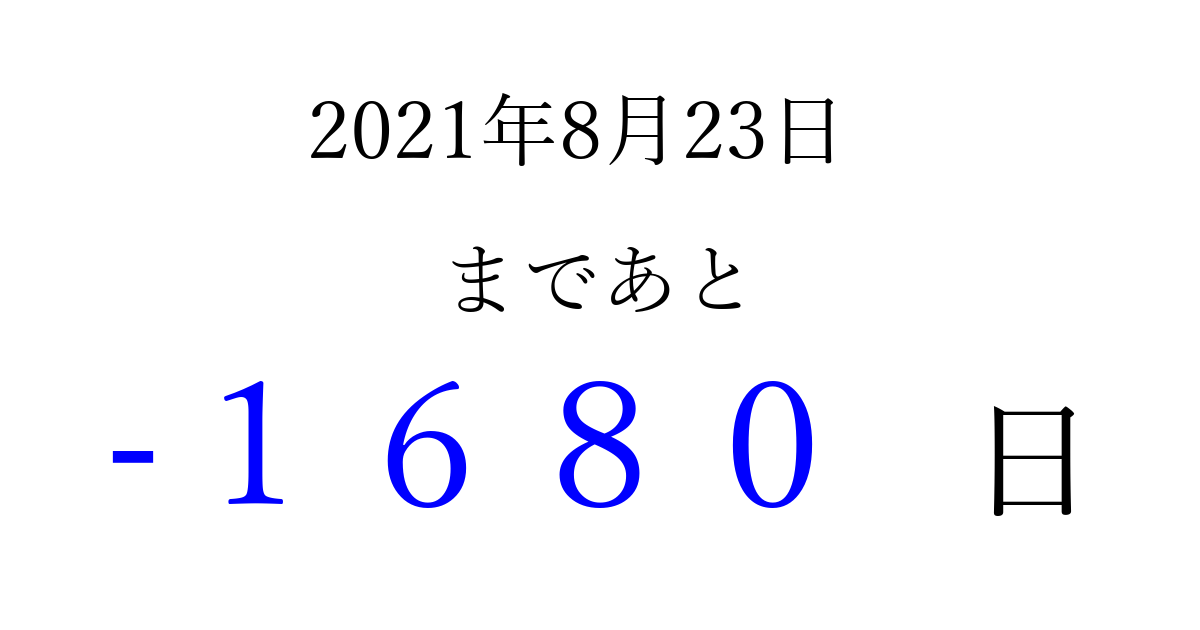 2021年8月23日(月)は もう 0000 日過ぎました 追加すると、トップページからすぐ選べるようになります ※2026/03/30現在の結果です。 最新の状態に更新する ↓シェアして、タイムライン上にカウントダウンを表示しよう!↓ 📤 この結果を共有する Tweet シェア Threads Bluesky 別の日付でカウントダウン 2021年8月のカレンダー このページをブックマークに追加すると、いつでもカウントダウンを確認できます。 (PC: Ctrl+D / Mac: ⌘+D) hitome-notes.comでは以下のページも運営しています。 指定日と期間から日付を計算 | ガチャ確率計算・シミュレーション | プライバシー・ポリシー 運営者:Avocado