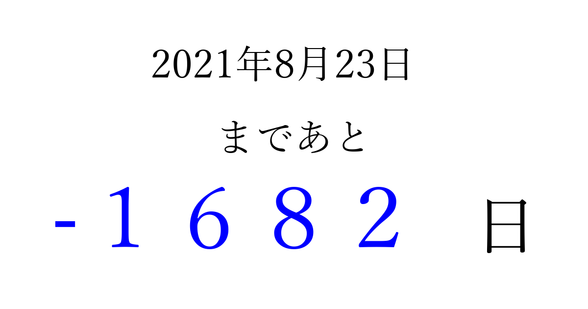 2021年8月23日(月)は もう 0000 日過ぎました 追加すると、トップページからすぐ選べるようになります ※2026/04/01現在の結果です。 最新の状態に更新する ↓シェアして、タイムライン上にカウントダウンを表示しよう!↓ 📤 この結果を共有する Tweet シェア Threads Bluesky 別の日付でカウントダウン 2021年8月のカレンダー このページをブックマークに追加すると、いつでもカウントダウンを確認できます。 (PC: Ctrl+D / Mac: ⌘+D) hitome-notes.comでは以下のページも運営しています。 指定日と期間から日付を計算 | ガチャ確率計算・シミュレーション | プライバシー・ポリシー 運営者:Avocado