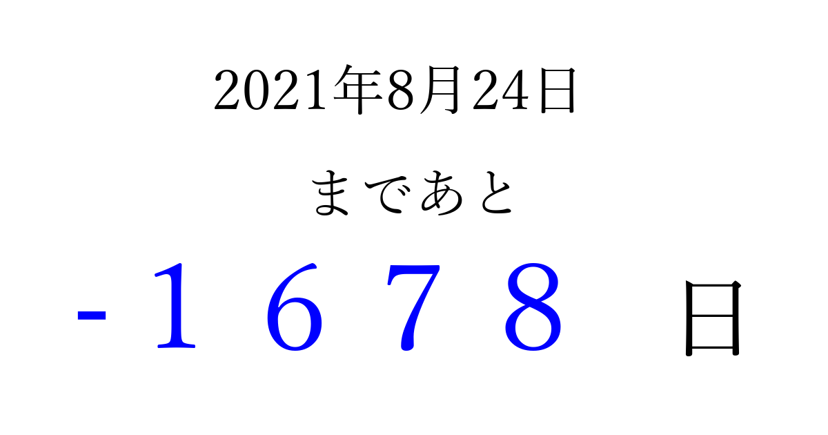 2021年8月24日(火)は もう 0000 日過ぎました 追加すると、トップページからすぐ選べるようになります ※2026/03/29現在の結果です。 最新の状態に更新する ↓シェアして、タイムライン上にカウントダウンを表示しよう!↓ 📤 この結果を共有する Tweet シェア Threads Bluesky この日は何の日?2020年東京パラリンピック 別の日付でカウントダウン 2021年8月のカレンダー このページをブックマークに追加すると、いつでもカウントダウンを確認できます。 (PC: Ctrl+D / Mac: ⌘+D) hitome-notes.comでは以下のページも運営しています。 指定日と期間から日付を計算 | ガチャ確率計算・シミュレーション | プライバシー・ポリシー 運営者:Avocado