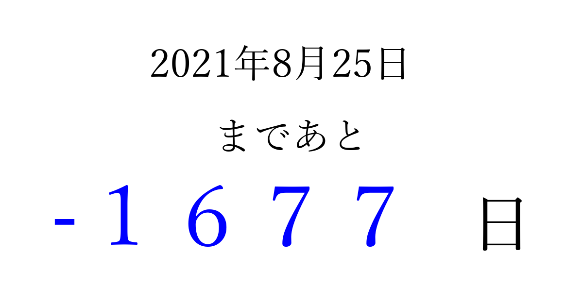 2021年8月25日(水)は もう 0000 日過ぎました 追加すると、トップページからすぐ選べるようになります ※2026/03/29現在の結果です。 最新の状態に更新する ↓シェアして、タイムライン上にカウントダウンを表示しよう!↓ 📤 この結果を共有する Tweet シェア Threads Bluesky 別の日付でカウントダウン 2021年8月のカレンダー このページをブックマークに追加すると、いつでもカウントダウンを確認できます。 (PC: Ctrl+D / Mac: ⌘+D) hitome-notes.comでは以下のページも運営しています。 指定日と期間から日付を計算 | ガチャ確率計算・シミュレーション | プライバシー・ポリシー 運営者:Avocado
