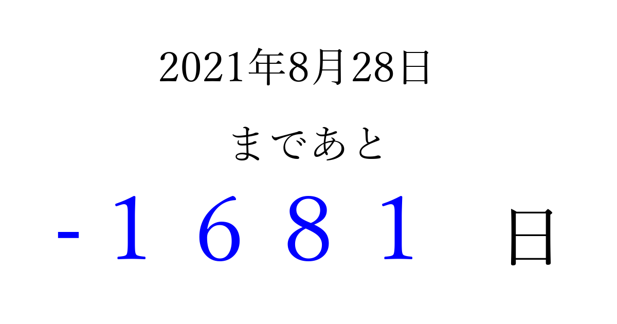 2021年8月28日(土)は もう 0000 日過ぎました 追加すると、トップページからすぐ選べるようになります ※2026/04/05現在の結果です。 最新の状態に更新する ↓シェアして、タイムライン上にカウントダウンを表示しよう!↓ 📤 この結果を共有する Tweet シェア Threads Bluesky 別の日付でカウントダウン 2021年8月のカレンダー このページをブックマークに追加すると、いつでもカウントダウンを確認できます。 (PC: Ctrl+D / Mac: ⌘+D) hitome-notes.comでは以下のページも運営しています。 指定日と期間から日付を計算 | ガチャ確率計算・シミュレーション | プライバシー・ポリシー 運営者:Avocado