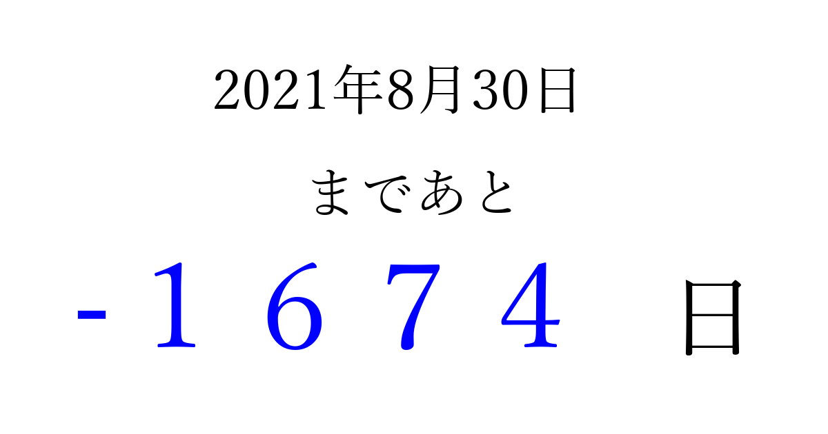 2021年8月30日(月)は もう 0000 日過ぎました 追加すると、トップページからすぐ選べるようになります ※2026/03/31現在の結果です。 最新の状態に更新する ↓シェアして、タイムライン上にカウントダウンを表示しよう!↓ 📤 この結果を共有する Tweet シェア Threads Bluesky 別の日付でカウントダウン 2021年8月のカレンダー このページをブックマークに追加すると、いつでもカウントダウンを確認できます。 (PC: Ctrl+D / Mac: ⌘+D) hitome-notes.comでは以下のページも運営しています。 指定日と期間から日付を計算 | ガチャ確率計算・シミュレーション | プライバシー・ポリシー 運営者:Avocado