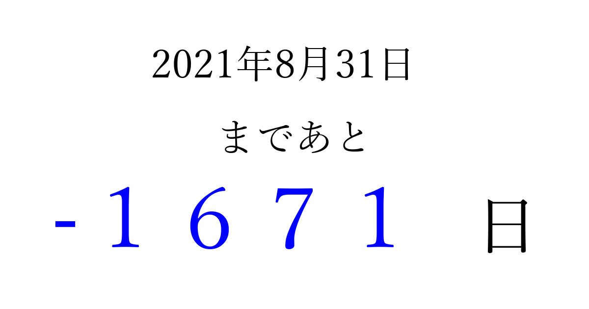 2021年8月31日(火)は もう 0000 日過ぎました 追加すると、トップページからすぐ選べるようになります ※2026/03/29現在の結果です。 最新の状態に更新する ↓シェアして、タイムライン上にカウントダウンを表示しよう!↓ 📤 この結果を共有する Tweet シェア Threads Bluesky 別の日付でカウントダウン 2021年8月のカレンダー このページをブックマークに追加すると、いつでもカウントダウンを確認できます。 (PC: Ctrl+D / Mac: ⌘+D) hitome-notes.comでは以下のページも運営しています。 指定日と期間から日付を計算 | ガチャ確率計算・シミュレーション | プライバシー・ポリシー 運営者:Avocado