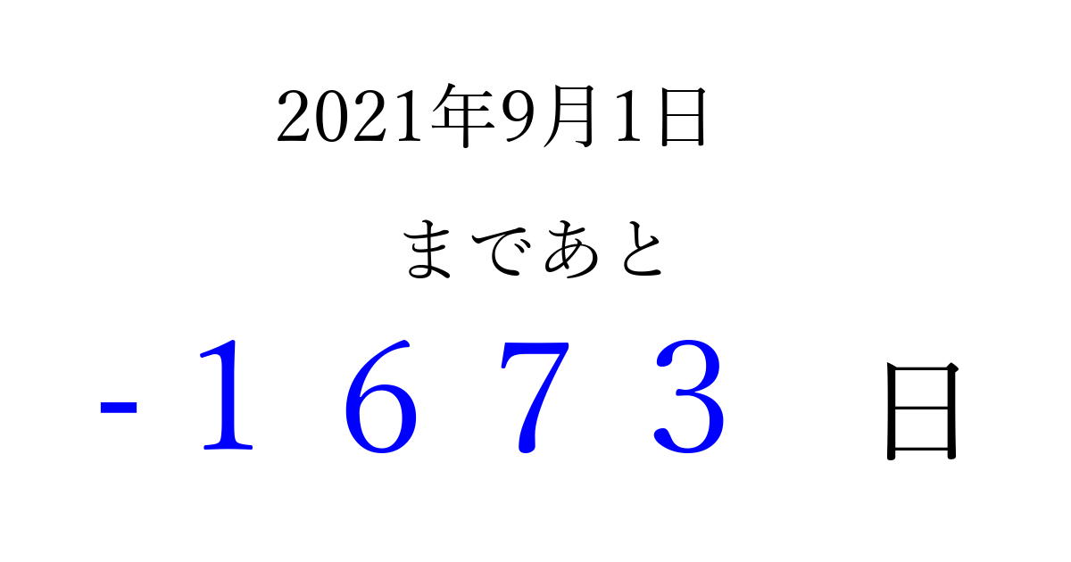 2021年9月1日(水)は もう 0000 日過ぎました 追加すると、トップページからすぐ選べるようになります ※2026/04/01現在の結果です。 最新の状態に更新する ↓シェアして、タイムライン上にカウントダウンを表示しよう!↓ 📤 この結果を共有する Tweet シェア Threads Bluesky 別の日付でカウントダウン 2021年9月のカレンダー このページをブックマークに追加すると、いつでもカウントダウンを確認できます。 (PC: Ctrl+D / Mac: ⌘+D) hitome-notes.comでは以下のページも運営しています。 指定日と期間から日付を計算 | ガチャ確率計算・シミュレーション | プライバシー・ポリシー 運営者:Avocado