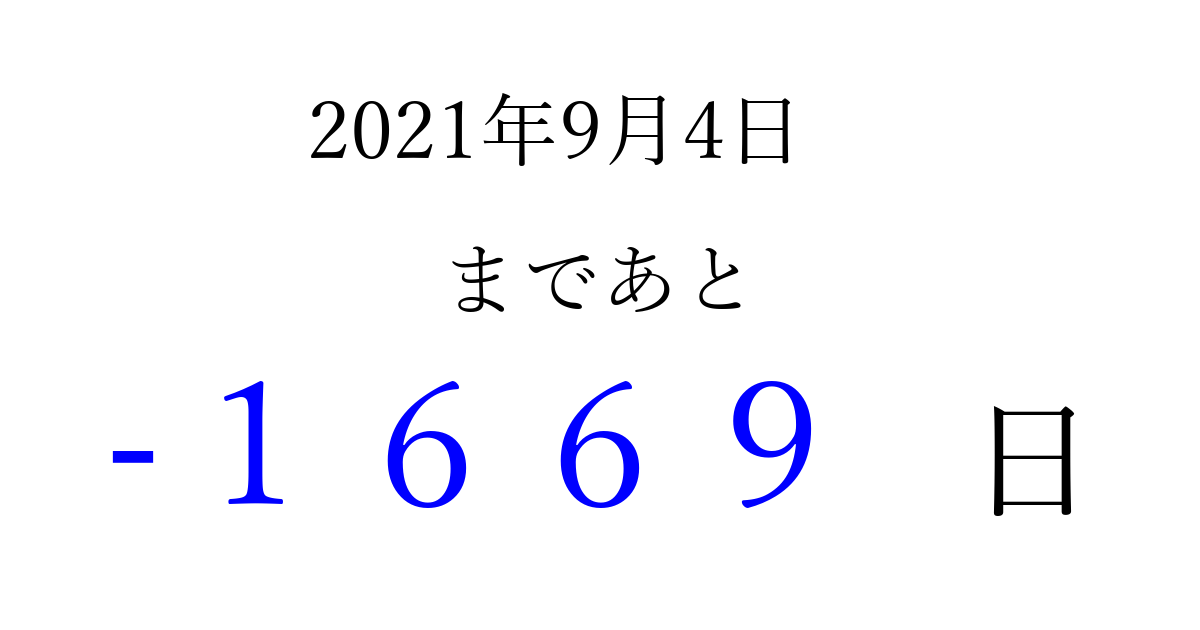 2021年9月4日(土)は もう 0000 日過ぎました 追加すると、トップページからすぐ選べるようになります ※2026/03/31現在の結果です。 最新の状態に更新する ↓シェアして、タイムライン上にカウントダウンを表示しよう!↓ 📤 この結果を共有する Tweet シェア Threads Bluesky 別の日付でカウントダウン 2021年9月のカレンダー このページをブックマークに追加すると、いつでもカウントダウンを確認できます。 (PC: Ctrl+D / Mac: ⌘+D) hitome-notes.comでは以下のページも運営しています。 指定日と期間から日付を計算 | ガチャ確率計算・シミュレーション | プライバシー・ポリシー 運営者:Avocado