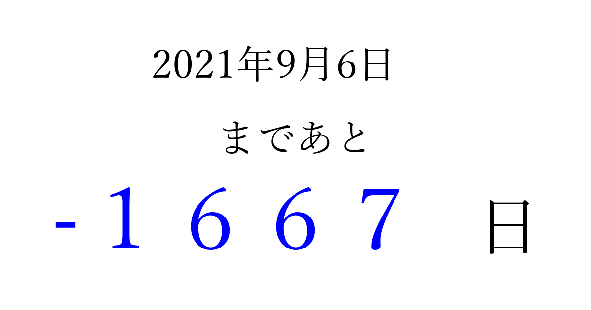 2021年9月6日(月)は もう 0000 日過ぎました 追加すると、トップページからすぐ選べるようになります ※2026/03/31現在の結果です。 最新の状態に更新する ↓シェアして、タイムライン上にカウントダウンを表示しよう!↓ 📤 この結果を共有する Tweet シェア Threads Bluesky 別の日付でカウントダウン 2021年9月のカレンダー このページをブックマークに追加すると、いつでもカウントダウンを確認できます。 (PC: Ctrl+D / Mac: ⌘+D) hitome-notes.comでは以下のページも運営しています。 指定日と期間から日付を計算 | ガチャ確率計算・シミュレーション | プライバシー・ポリシー 運営者:Avocado