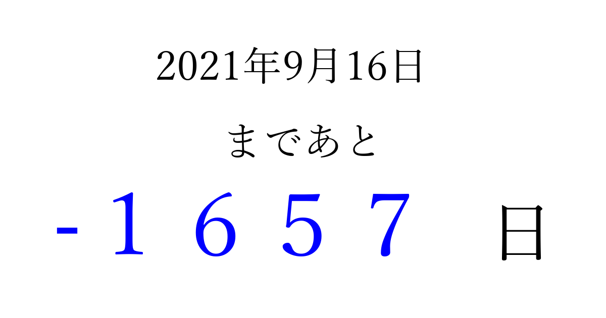 2021年9月16日(木)は もう 0000 日過ぎました 追加すると、トップページからすぐ選べるようになります ※2026/03/31現在の結果です。 最新の状態に更新する ↓シェアして、タイムライン上にカウントダウンを表示しよう!↓ 📤 この結果を共有する Tweet シェア Threads Bluesky 別の日付でカウントダウン 2021年9月のカレンダー このページをブックマークに追加すると、いつでもカウントダウンを確認できます。 (PC: Ctrl+D / Mac: ⌘+D) hitome-notes.comでは以下のページも運営しています。 指定日と期間から日付を計算 | ガチャ確率計算・シミュレーション | プライバシー・ポリシー 運営者:Avocado