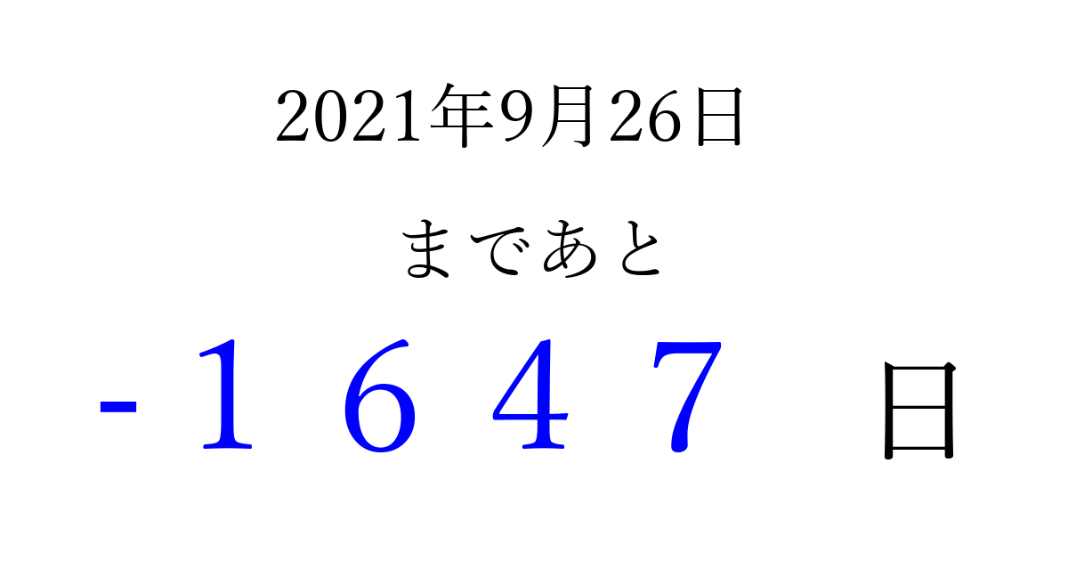 2021年9月26日(日)は もう 0000 日過ぎました 追加すると、トップページからすぐ選べるようになります ※2026/03/31現在の結果です。 最新の状態に更新する ↓シェアして、タイムライン上にカウントダウンを表示しよう!↓ 📤 この結果を共有する Tweet シェア Threads Bluesky 別の日付でカウントダウン 2021年9月のカレンダー このページをブックマークに追加すると、いつでもカウントダウンを確認できます。 (PC: Ctrl+D / Mac: ⌘+D) hitome-notes.comでは以下のページも運営しています。 指定日と期間から日付を計算 | ガチャ確率計算・シミュレーション | プライバシー・ポリシー 運営者:Avocado