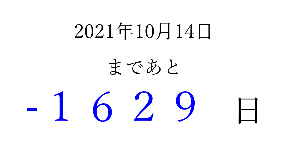 2021年10月14日(木)は もう 0000 日過ぎました 追加すると、トップページからすぐ選べるようになります ※2026/03/31現在の結果です。 最新の状態に更新する ↓シェアして、タイムライン上にカウントダウンを表示しよう!↓ 📤 この結果を共有する Tweet シェア Threads Bluesky 別の日付でカウントダウン 2021年10月のカレンダー このページをブックマークに追加すると、いつでもカウントダウンを確認できます。 (PC: Ctrl+D / Mac: ⌘+D) hitome-notes.comでは以下のページも運営しています。 指定日と期間から日付を計算 | ガチャ確率計算・シミュレーション | プライバシー・ポリシー 運営者:Avocado