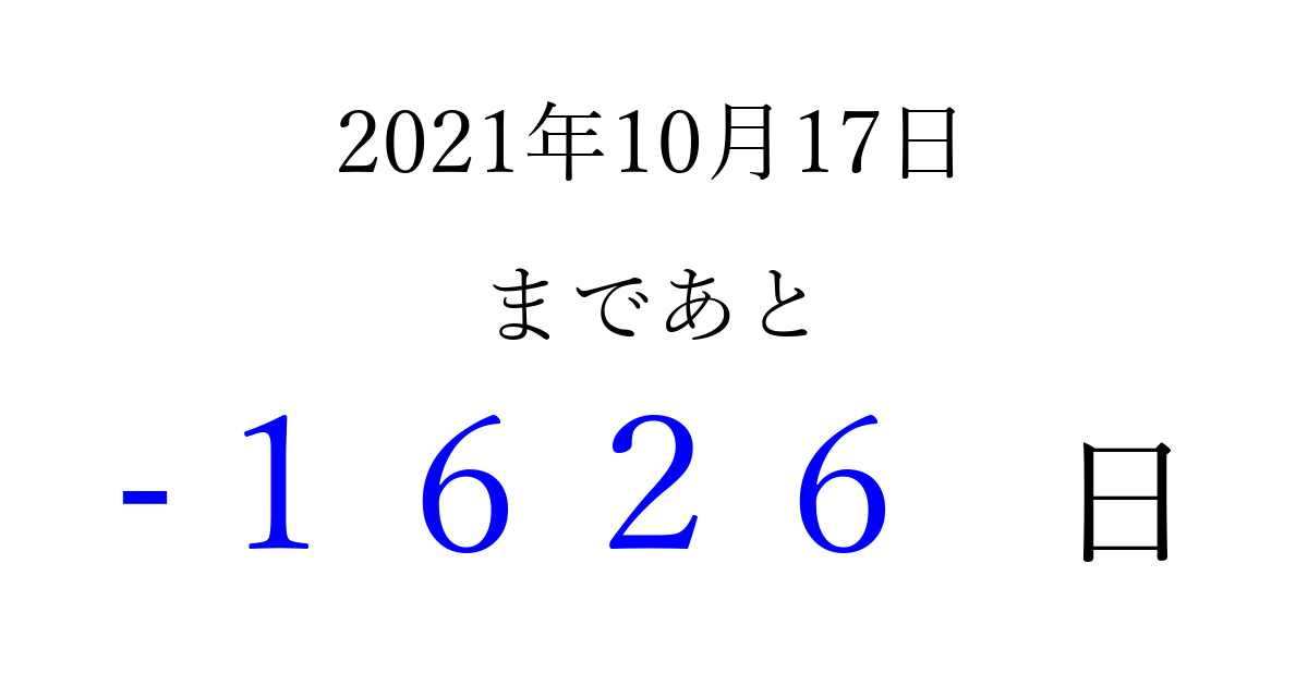 2021年10月17日(日)は もう 0000 日過ぎました 追加すると、トップページからすぐ選べるようになります ※2026/03/31現在の結果です。 最新の状態に更新する ↓シェアして、タイムライン上にカウントダウンを表示しよう!↓ 📤 この結果を共有する Tweet シェア Threads Bluesky 別の日付でカウントダウン 2021年10月のカレンダー このページをブックマークに追加すると、いつでもカウントダウンを確認できます。 (PC: Ctrl+D / Mac: ⌘+D) hitome-notes.comでは以下のページも運営しています。 指定日と期間から日付を計算 | ガチャ確率計算・シミュレーション | プライバシー・ポリシー 運営者:Avocado