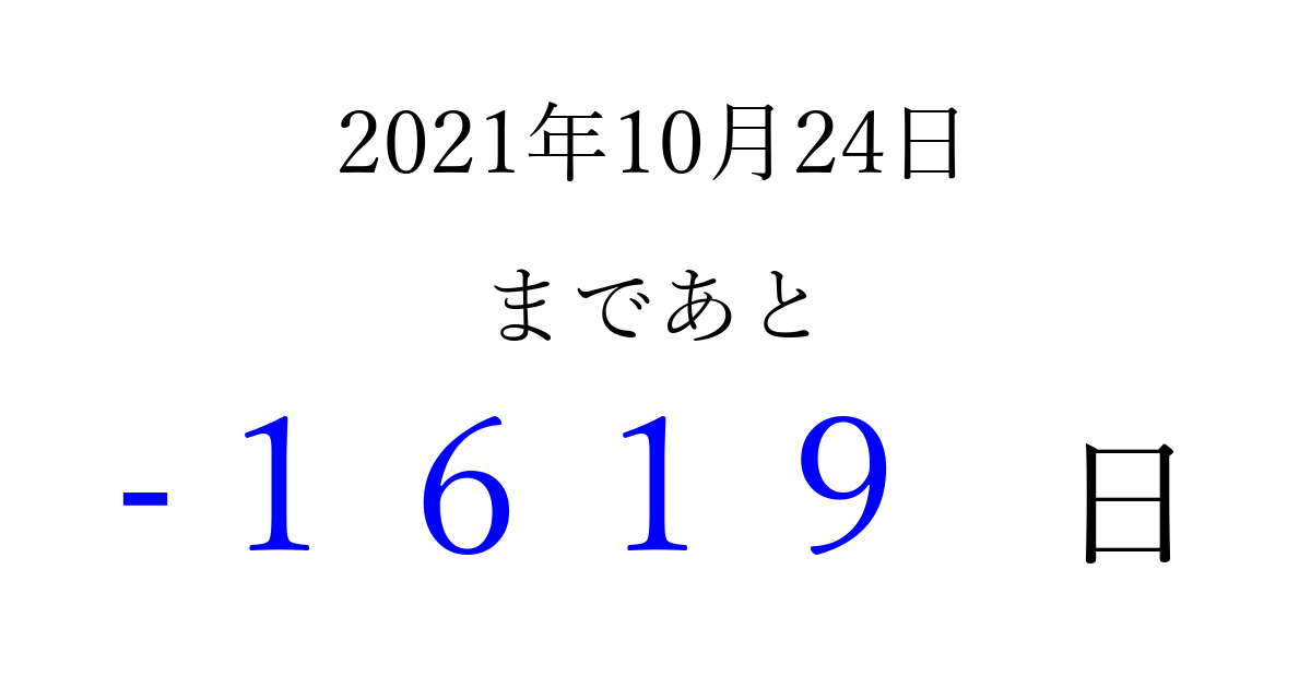 2021年10月24日(日)は もう 0000 日過ぎました 追加すると、トップページからすぐ選べるようになります ※2026/03/31現在の結果です。 最新の状態に更新する ↓シェアして、タイムライン上にカウントダウンを表示しよう!↓ 📤 この結果を共有する Tweet シェア Threads Bluesky 別の日付でカウントダウン 2021年10月のカレンダー このページをブックマークに追加すると、いつでもカウントダウンを確認できます。 (PC: Ctrl+D / Mac: ⌘+D) hitome-notes.comでは以下のページも運営しています。 指定日と期間から日付を計算 | ガチャ確率計算・シミュレーション | プライバシー・ポリシー 運営者:Avocado