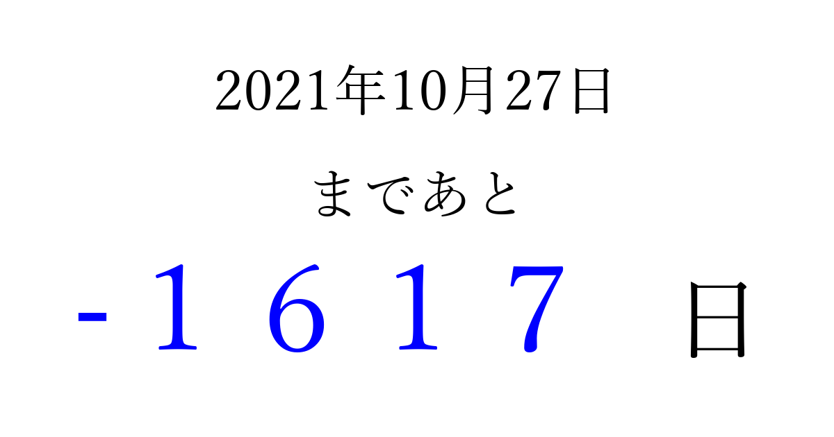 2021年10月27日(水)は もう 0000 日過ぎました 追加すると、トップページからすぐ選べるようになります ※2026/04/01現在の結果です。 最新の状態に更新する ↓シェアして、タイムライン上にカウントダウンを表示しよう!↓ 📤 この結果を共有する Tweet シェア Threads Bluesky 別の日付でカウントダウン 2021年10月のカレンダー このページをブックマークに追加すると、いつでもカウントダウンを確認できます。 (PC: Ctrl+D / Mac: ⌘+D) hitome-notes.comでは以下のページも運営しています。 指定日と期間から日付を計算 | ガチャ確率計算・シミュレーション | プライバシー・ポリシー 運営者:Avocado