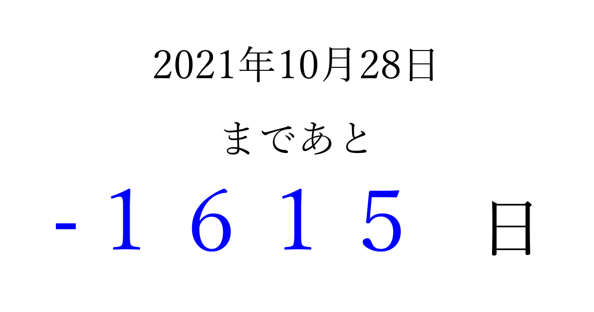 2021年10月28日(木)は もう 0000 日過ぎました 追加すると、トップページからすぐ選べるようになります ※2026/03/31現在の結果です。 最新の状態に更新する ↓シェアして、タイムライン上にカウントダウンを表示しよう!↓ 📤 この結果を共有する Tweet シェア Threads Bluesky 別の日付でカウントダウン 2021年10月のカレンダー このページをブックマークに追加すると、いつでもカウントダウンを確認できます。 (PC: Ctrl+D / Mac: ⌘+D) hitome-notes.comでは以下のページも運営しています。 指定日と期間から日付を計算 | ガチャ確率計算・シミュレーション | プライバシー・ポリシー 運営者:Avocado