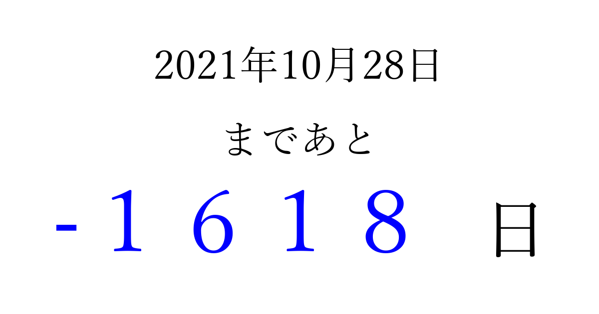 2021年10月28日(木)は もう 0000 日過ぎました 追加すると、トップページからすぐ選べるようになります ※2026/04/03現在の結果です。 最新の状態に更新する ↓シェアして、タイムライン上にカウントダウンを表示しよう!↓ 📤 この結果を共有する Tweet シェア Threads Bluesky 別の日付でカウントダウン 2021年10月のカレンダー このページをブックマークに追加すると、いつでもカウントダウンを確認できます。 (PC: Ctrl+D / Mac: ⌘+D) hitome-notes.comでは以下のページも運営しています。 指定日と期間から日付を計算 | ガチャ確率計算・シミュレーション | プライバシー・ポリシー 運営者:Avocado