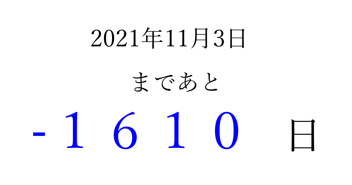 2021年11月3日(水)は もう 0000 日過ぎました 追加すると、トップページからすぐ選べるようになります ※2026/04/01現在の結果です。 最新の状態に更新する ↓シェアして、タイムライン上にカウントダウンを表示しよう!↓ 📤 この結果を共有する Tweet シェア Threads Bluesky この日は何の日?文化の日 別の日付でカウントダウン 2021年11月のカレンダー このページをブックマークに追加すると、いつでもカウントダウンを確認できます。 (PC: Ctrl+D / Mac: ⌘+D) hitome-notes.comでは以下のページも運営しています。 指定日と期間から日付を計算 | ガチャ確率計算・シミュレーション | プライバシー・ポリシー 運営者:Avocado