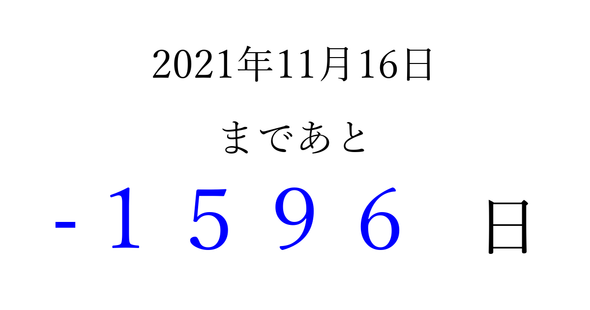 2021年11月16日(火)は もう 0000 日過ぎました 追加すると、トップページからすぐ選べるようになります ※2026/03/31現在の結果です。 最新の状態に更新する ↓シェアして、タイムライン上にカウントダウンを表示しよう!↓ 📤 この結果を共有する Tweet シェア Threads Bluesky 別の日付でカウントダウン 2021年11月のカレンダー このページをブックマークに追加すると、いつでもカウントダウンを確認できます。 (PC: Ctrl+D / Mac: ⌘+D) hitome-notes.comでは以下のページも運営しています。 指定日と期間から日付を計算 | ガチャ確率計算・シミュレーション | プライバシー・ポリシー 運営者:Avocado