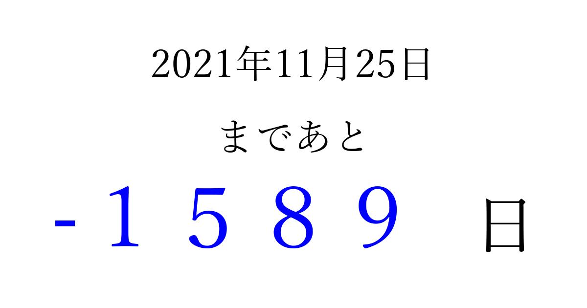 2021年11月25日(木)は もう 0000 日過ぎました 追加すると、トップページからすぐ選べるようになります ※2026/04/02現在の結果です。 最新の状態に更新する ↓シェアして、タイムライン上にカウントダウンを表示しよう!↓ 📤 この結果を共有する Tweet シェア Threads Bluesky 別の日付でカウントダウン 2021年11月のカレンダー このページをブックマークに追加すると、いつでもカウントダウンを確認できます。 (PC: Ctrl+D / Mac: ⌘+D) hitome-notes.comでは以下のページも運営しています。 指定日と期間から日付を計算 | ガチャ確率計算・シミュレーション | プライバシー・ポリシー 運営者:Avocado