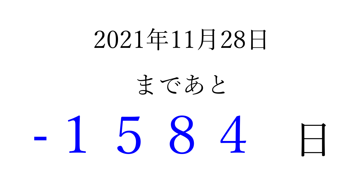 2021年11月28日(日)は もう 0000 日過ぎました 追加すると、トップページからすぐ選べるようになります ※2026/03/31現在の結果です。 最新の状態に更新する ↓シェアして、タイムライン上にカウントダウンを表示しよう!↓ 📤 この結果を共有する Tweet シェア Threads Bluesky 別の日付でカウントダウン 2021年11月のカレンダー このページをブックマークに追加すると、いつでもカウントダウンを確認できます。 (PC: Ctrl+D / Mac: ⌘+D) hitome-notes.comでは以下のページも運営しています。 指定日と期間から日付を計算 | ガチャ確率計算・シミュレーション | プライバシー・ポリシー 運営者:Avocado