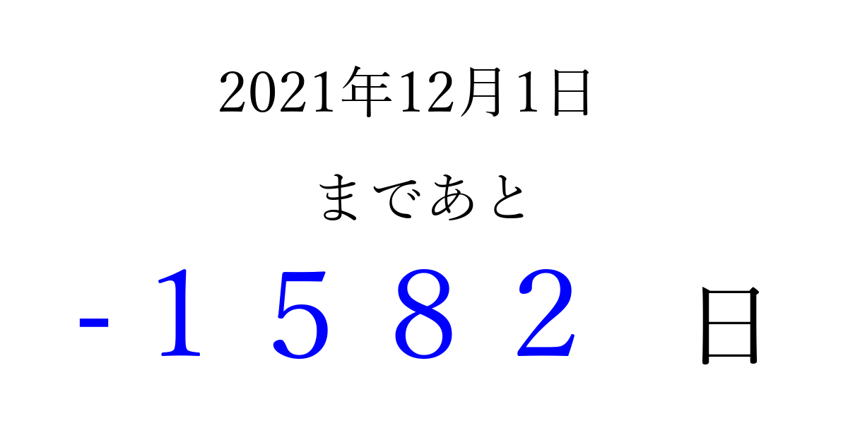 2021年12月1日(水)は もう 0000 日過ぎました 追加すると、トップページからすぐ選べるようになります ※2026/04/01現在の結果です。 最新の状態に更新する ↓シェアして、タイムライン上にカウントダウンを表示しよう!↓ 📤 この結果を共有する Tweet シェア Threads Bluesky 別の日付でカウントダウン 2021年12月のカレンダー このページをブックマークに追加すると、いつでもカウントダウンを確認できます。 (PC: Ctrl+D / Mac: ⌘+D) hitome-notes.comでは以下のページも運営しています。 指定日と期間から日付を計算 | ガチャ確率計算・シミュレーション | プライバシー・ポリシー 運営者:Avocado