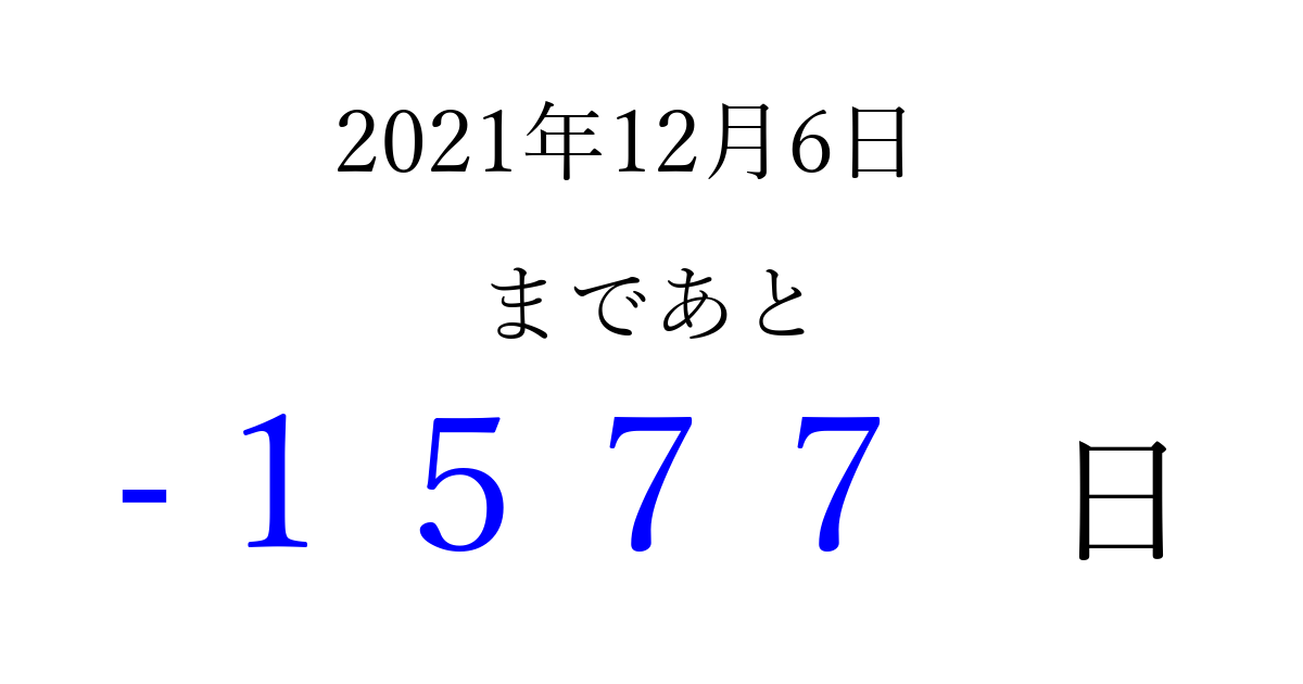 2021年12月6日(月)は もう 0000 日過ぎました 追加すると、トップページからすぐ選べるようになります ※2026/04/01現在の結果です。 最新の状態に更新する ↓シェアして、タイムライン上にカウントダウンを表示しよう!↓ 📤 この結果を共有する Tweet シェア Threads Bluesky 別の日付でカウントダウン 2021年12月のカレンダー このページをブックマークに追加すると、いつでもカウントダウンを確認できます。 (PC: Ctrl+D / Mac: ⌘+D) hitome-notes.comでは以下のページも運営しています。 指定日と期間から日付を計算 | ガチャ確率計算・シミュレーション | プライバシー・ポリシー 運営者:Avocado