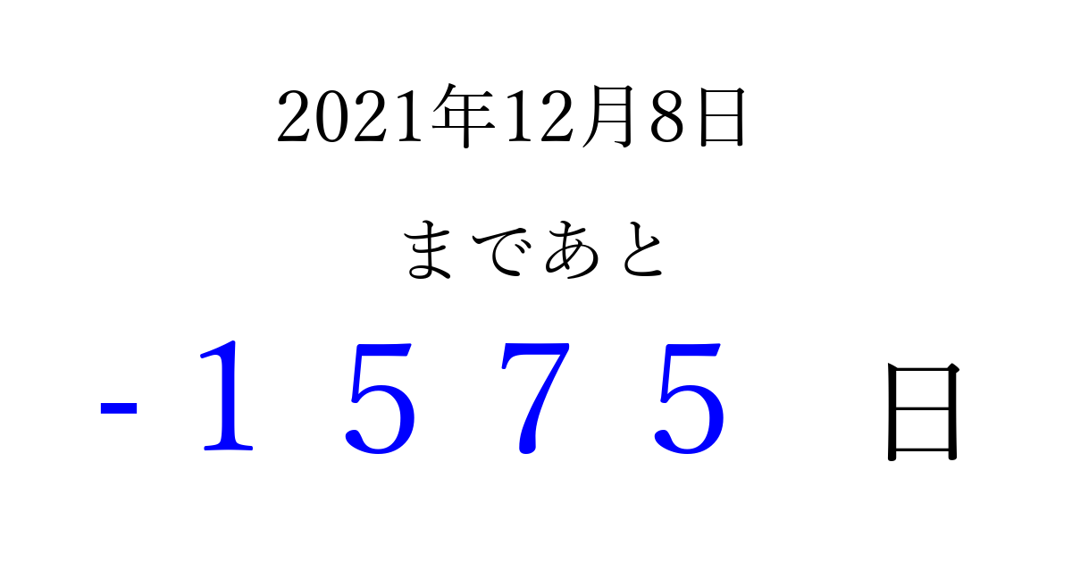 2021年12月8日(水)は もう 0000 日過ぎました 追加すると、トップページからすぐ選べるようになります ※2026/04/01現在の結果です。 最新の状態に更新する ↓シェアして、タイムライン上にカウントダウンを表示しよう!↓ 📤 この結果を共有する Tweet シェア Threads Bluesky 別の日付でカウントダウン 2021年12月のカレンダー このページをブックマークに追加すると、いつでもカウントダウンを確認できます。 (PC: Ctrl+D / Mac: ⌘+D) hitome-notes.comでは以下のページも運営しています。 指定日と期間から日付を計算 | ガチャ確率計算・シミュレーション | プライバシー・ポリシー 運営者:Avocado