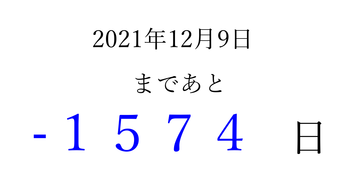 2021年12月9日(木)は もう 0000 日過ぎました 追加すると、トップページからすぐ選べるようになります ※2026/04/01現在の結果です。 最新の状態に更新する ↓シェアして、タイムライン上にカウントダウンを表示しよう!↓ 📤 この結果を共有する Tweet シェア Threads Bluesky 別の日付でカウントダウン 2021年12月のカレンダー このページをブックマークに追加すると、いつでもカウントダウンを確認できます。 (PC: Ctrl+D / Mac: ⌘+D) hitome-notes.comでは以下のページも運営しています。 指定日と期間から日付を計算 | ガチャ確率計算・シミュレーション | プライバシー・ポリシー 運営者:Avocado