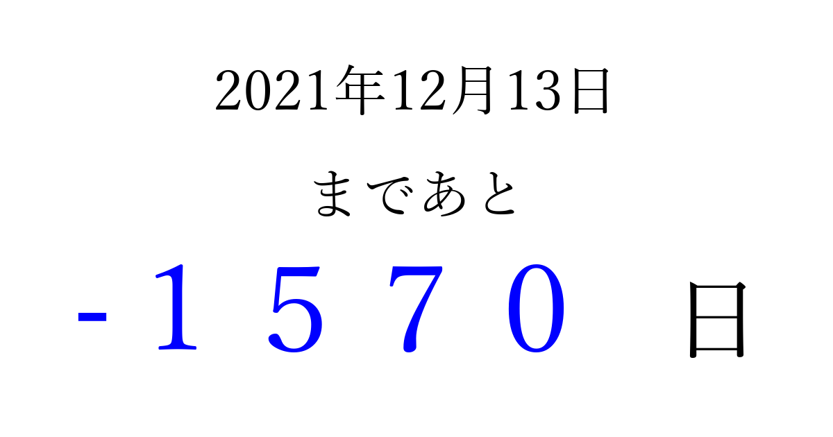 2021年12月13日(月)は もう 0000 日過ぎました 追加すると、トップページからすぐ選べるようになります ※2026/04/01現在の結果です。 最新の状態に更新する ↓シェアして、タイムライン上にカウントダウンを表示しよう!↓ 📤 この結果を共有する Tweet シェア Threads Bluesky 別の日付でカウントダウン 2021年12月のカレンダー このページをブックマークに追加すると、いつでもカウントダウンを確認できます。 (PC: Ctrl+D / Mac: ⌘+D) hitome-notes.comでは以下のページも運営しています。 指定日と期間から日付を計算 | ガチャ確率計算・シミュレーション | プライバシー・ポリシー 運営者:Avocado